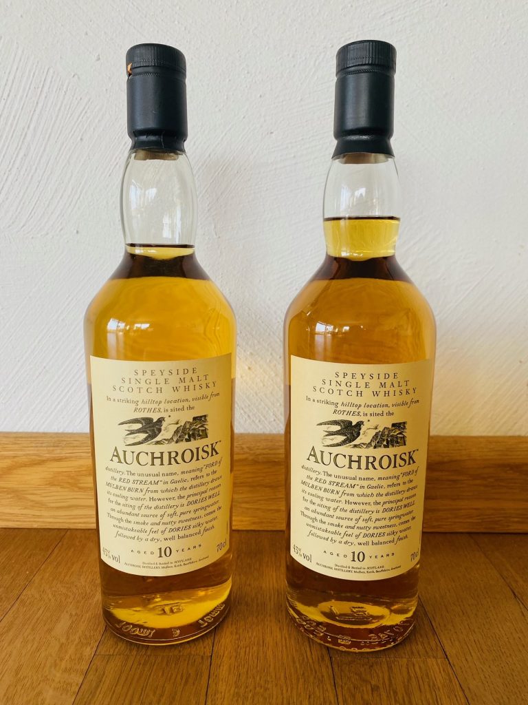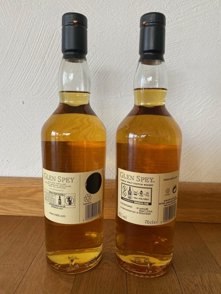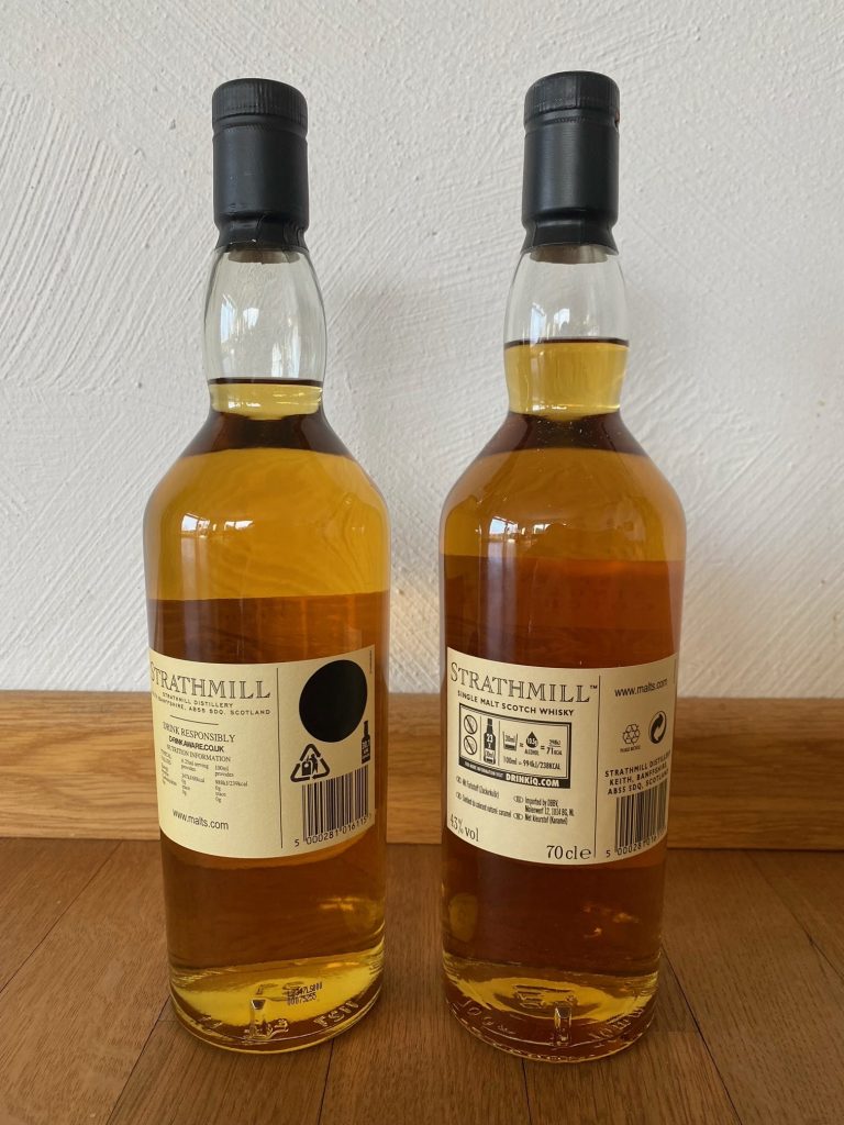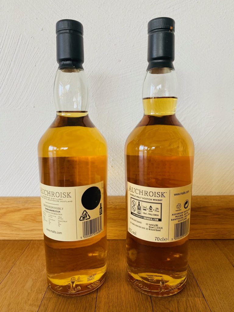 Bei den 2001 und der 2021 Serie gibt es Überschneidungen und einige Spaßvögel bieten die neuen für teures Geld als alte Flaschen an. Man kann die Flaschen aber unterscheiden. Hier mal die alten Flaschen links und die neuen Flaschen rechts. Hierbei ist unter dem schwarzen Kreis, den man abknibbeln kann, die UK Steuermarke. Außerdem haben die alten Flaschen alle eine kleinen BottleCode auf der Flasche an der Rückseite über der Glasnase in Bodennähe aufgedruckt – bei der neuen Serie spart man sich den BottleCode.