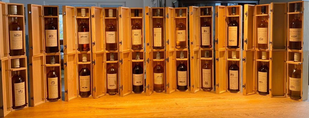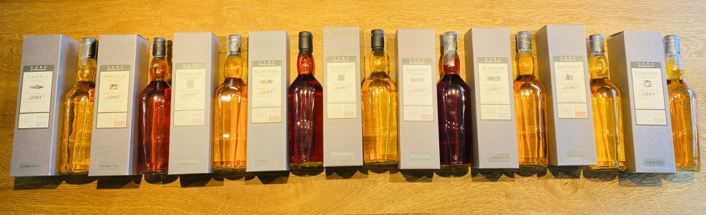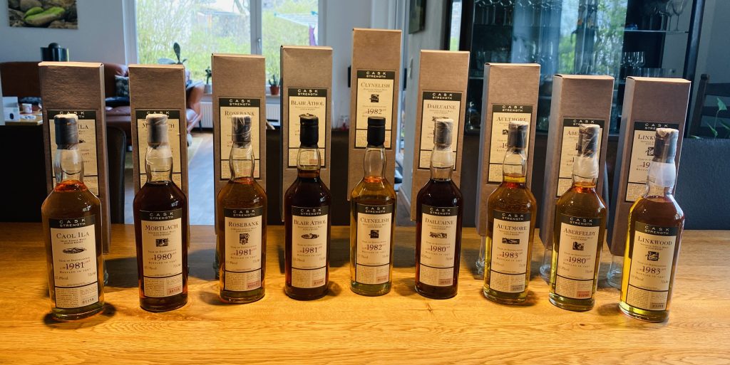 Im Prinzip ist also alles, was nicht mehr zum Konzern gehört oder nicht mehr (oder nicht mehr in der alten Form) brennt am schwierigsten zu ergattern und das natürlich zu den höchsten Preisen. Serie 1 Flaschen in der Wooden Box „Black Cap“ bekommt man in gutem Zustand ab rund 300 €, „White Caps“ sind teurer. Royal Brackla, Craigellachie, Aberfeldy, Balmenach sind wieder etwas teurer, der Mortlach White Cap in der Box geht auch mal für einen Tausender über den Tisch, Rosebank, Pittyvaich sind schon nicht wirklich günstig und der Speyburn erzielt auf Aktionen auch gerne mal über 3000 € wenn er mit der Wooden Box daher kommt. Alles Indikatoren und im Prinzip ist eine Serie 1 + Serie 2001 Sammlung (also 26 Flaschen) rund 14.000 € Wert. Die 9 Flaschen in Fassstärke werden als komplette Serie für knapp10.000 € gehandelt wenn sie alle in den Kartons stecken. Die 11 Flaschen von 2021 mit rund 700 €.