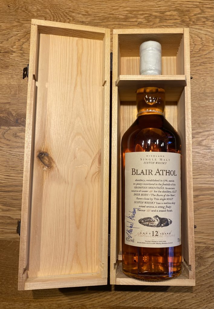 Für diese schöne Story spricht, dass es seltene Exemplare mit Signatur gibt, wie meine Ausgabe des Blair Athol. Diese ist signiert von Michael Nicholson, dem damaligen Disitillery Manager von Blair Athol (das war er von ca. 1988 – 1994 wie mir Derek Younie der heutige Manager dort erzählte). Mike Nichsolson ist ein größe bei United Distilliers bzw. Diageo gewesen. Er hat seit seiner Jugend in Destillerien gewirkt, wie schon sein Vater und Großvater und war in fast 40 Jahren Master Distiller und Distillery Manager bei nicht weniger als 18 schottischen Whisky Brennereien, bevor er nach Kanada in Rente ging, um …. auch dort wieder in der Whisky Szene aktiv zu sein.