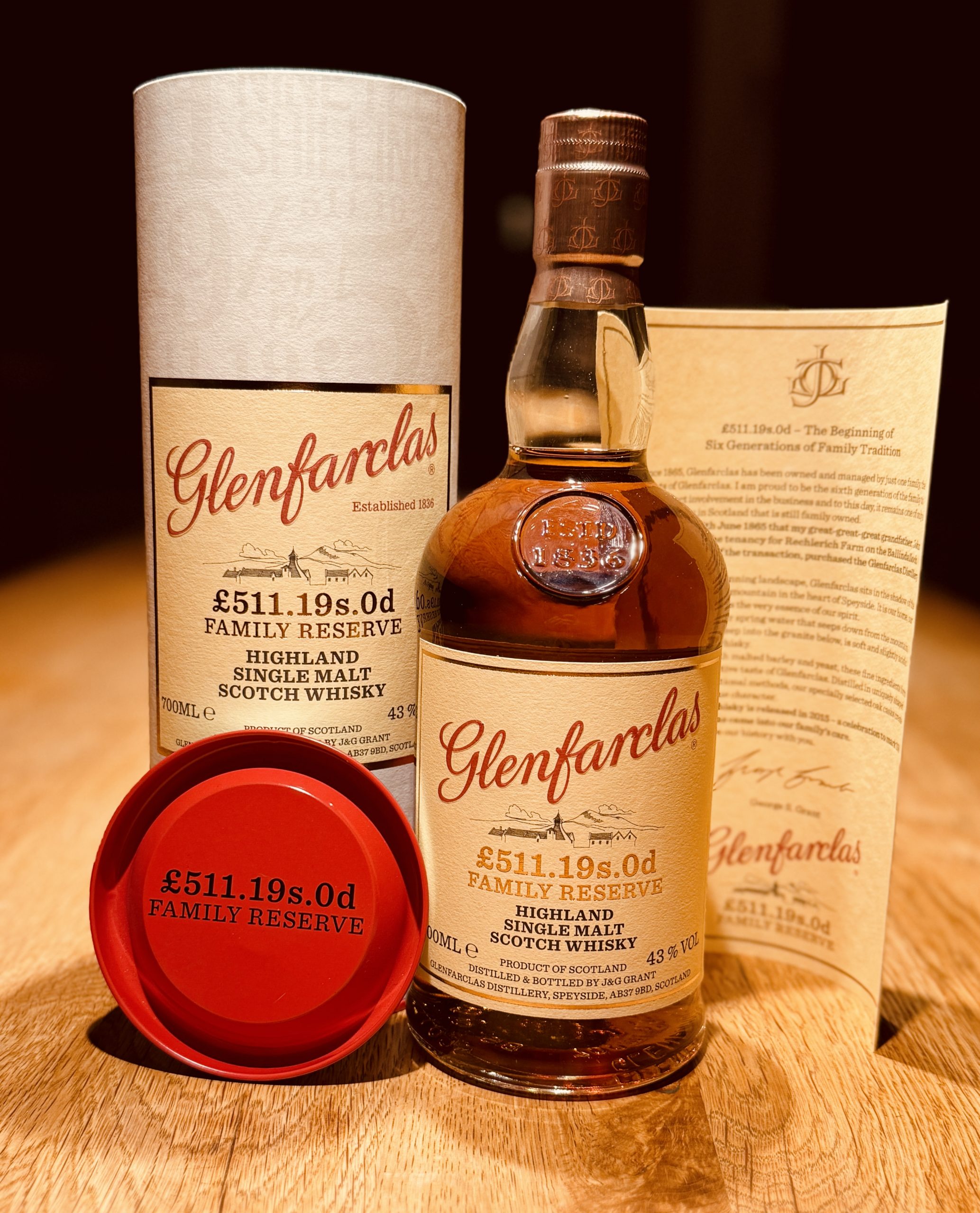 Seit 6 Generationen befindet sich die Brennerei Glenfarclas (1836 von Robert Hay gegründet) bereits im Besitz der Familie Grant. 1865 haben John Grant und sein Sohn George die Brennerei für £511.19s.0d (511 Pfund 19 Schilling 0 Pence) gekauft. Dazu gibt es auch den passenden Whisky: £511.19s.0d. Glenfarclas Distilled Family Reserve – 150th Anniversary of Grant Family’s Ownership von 2015.